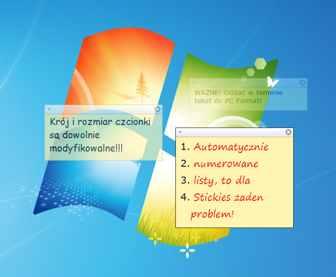 Prosty, ale jakże przydatny programik Stickies, dodający do systemu funkcję „żółtych karteczek”. Koniec zatem z zaśmiecaniem meblowego biurka karteczkami zawierającymi podręczne notatki. Dzięki Stickies możesz „przyklejać” notatki do pulpitu Windows. Niczego nie zapomnisz, a jakie to ekologiczne. Programów tego typu jest sporo, ale Stickies wyróżnia się ciekawymi funkcjami, z których warto wymienić np. możliwość wysyłania notatek do innych komputerów przez sieć (TCP/IP) czy przez serwer pocztowy (SMTP). W praktyce oznacza to, że „przypominajki” możesz ustawiać nie tylko sobie, ale także współpracownikom. Przy czym każda z notatek może być wzbogacona sygnałem dźwiękowym przy odbiorze. To nie wszystko – Stickies umożliwia także ustawienie, by zdefiniowana przez ciebie notatka pojawiła się na ekranie o konkretnej godzinie. Dostęp do opcji programu uzyskasz, klikając prawym klawiszem myszki ikonkę umieszczaną po instalacji w zasobniku systemowym na pasku zadań. Natomiast dwukrotne kliknięcie tej ikonki lewym przyciskiem dodaje nową notatkę na pulpit. Alternatywnie możesz użyć skrótu klawiszowego [Ctrl]+[N].