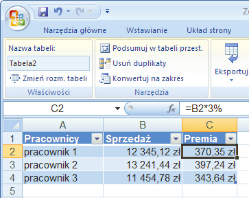 Sposób zaokrąglania przedstawimy na przykładzie tabeli zawierającej wyniki sprzedaży uzyskane przez trzech pracowników przykładowej firmy (wyniki sprzedaży z dokładnością co do grosza przedstawia kolumna B). Załóżmy, że ustalona prowizja wynosi 3 proc. od kwoty sprzedaży (patrz kolumna C). Formuła obliczająca prowizję jest bardzo prosta, np. dla pierwszego wiersza danych przedstawia się następująco: