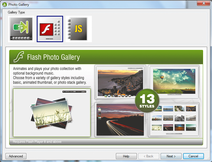 W programie WebPlus Starter Edition z zakładki QuickBuilder Bar przeciągnij na obszar roboczy ikonę Photo Gallery. Otworzy się okno Photo Gallery. Wybierz jeden z mechanizmów dostępnych w sekcji Gallery Type. W naszym przykładzie wybraliśmy ikonę Flash i pokażemy, jak założyć galerię Flash Photo Gallery. Proces dodawania zdjęć do galerii jest w obu wypadkach taki sam. W tym samym oknie kliknij przycisk Advanced.