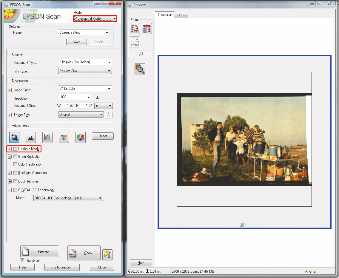 Przed zeskanowaniem fotografii wyłącz wszystkie opcje korekcji zdjęcia poza autoekspozycją. Prezentowany ekran pochodzi ze sterownika skanera Epson. Aby w tym urządzeniu wyłączyć wszystkie korekcje podczas skanowania, uruchom sterownik w trybie Professional Mode, następnie odznacz wszystkie opcje, jakie znajdują się w sekcji Adjustments. Szczególnie ważne jest wyłączenie wyostrzania Unsharp Mask, ponieważ wyostrzanie przed retuszem obniża jakość końcowego efektu.