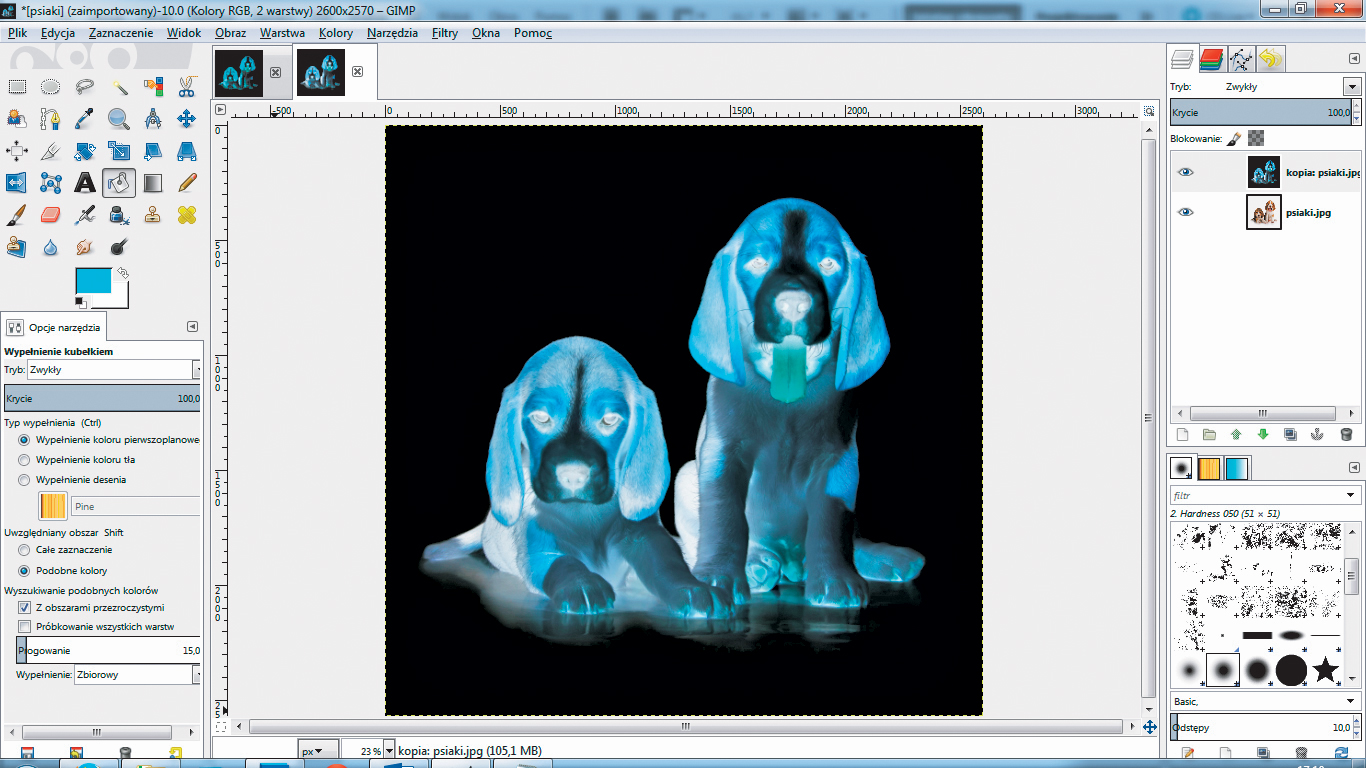 Uruchom program GIMP i z menu Plik wybierz opcję Otwórz. W otwartym oknie Otwarcie obrazu wybierz z dysku fotografię, w naszym przykładzie psiaki.jpg, i kliknij przycisk Otwórz.