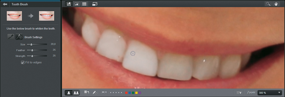 Wybierz narzędzie Tooth Brush. Widoczna para ikon jest przeznaczona do przełączania między pędzlami wybielającym i usuwającym efekt wybielania. Suwaki poniżej służą do regulacji wielkości pędzla oraz siły nakładanego efektu. Włączona opcja Fit to edges uchroni przed wysunięciem pędzla poza obrys wybielanych zębów. Aby rozpocząć wybielanie, wybierz w Eksploratorze miniaturę fotografii. Następnie, za pomocą listy Zoom, odpowiednio przybliż jej fragment i za pomocą kursora myszki rozpocznij wybielanie zębów. Zmiany na zdjęciu możesz anulować kombinacją klawiszy [Ctrl]+[Z]. Zmodyfikowaną fotografię zapisz, wybierając z menu File opcję Save As.