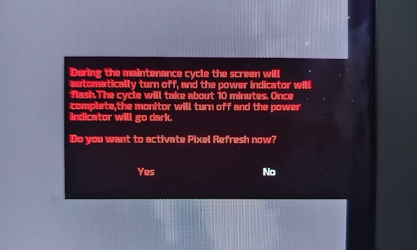 Inną kwestią jest fakt, że po czterech godzinach pracy ekran pracujący na standardowych ustawieniach domaga się przerwy, by przeprowadzić odświeżanie pikseli. To kolejne zabezpieczenie przed wypaleniem matrycy. Komunikaty tego rodzaju można oczywiście ignorować, jeśli robimy coś pilnego i nie możemy sobie pozwolić na pauzę. W końcu jednak, po szesnastu godzinach bezustannego działania jest to obowiązkowe. U mnie konieczność ta pojawia się za każdym razem gdzieś między północą a godzina drugą. I w takim wypadku już próby przeciągnięcia sprawy nic nie dają: monitor domaga się podjęcia akcji, odmierzając czas do automatycznego wyłączenia. Cóż, z tym – dla własnego dobra – trzeba się już nauczyć żyć. To jednak scenariusz ekstremalny: normalnie, w ciągu dnia, można sobie np. zrobić przerwę na kawę lub – jak już wspomniałem – proces odświeżania zwyczajnie zignorować. Raz na dobę jednak tak czy inaczej nie ma zmiłuj. Pewnego rodzaju ratunkiem jest fakt, że monitor przeprowadza odświeżanie w ciągu dnia w sposób automatyczny, jeśli tylko wykryje, że przez 15 minut z niego nie korzystamy, a potem się wyłącza.