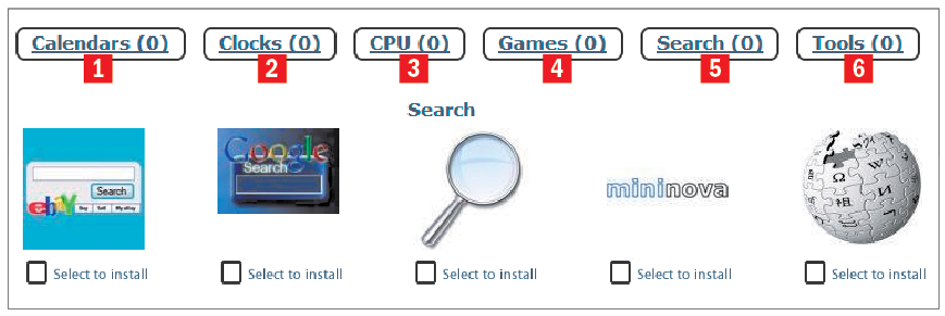Przejdź po wszystkich kategoriach. Gadżety, które masz zamiar zainstalować, zaznacz, stawiając znak X w polu Select to install znajdującym się poniżej miniaturek. Liczniki przy nazwach poszczególnych kategorii będą zmieniały swoją wartość na adekwatną do liczby zaznaczonych gadżetów.