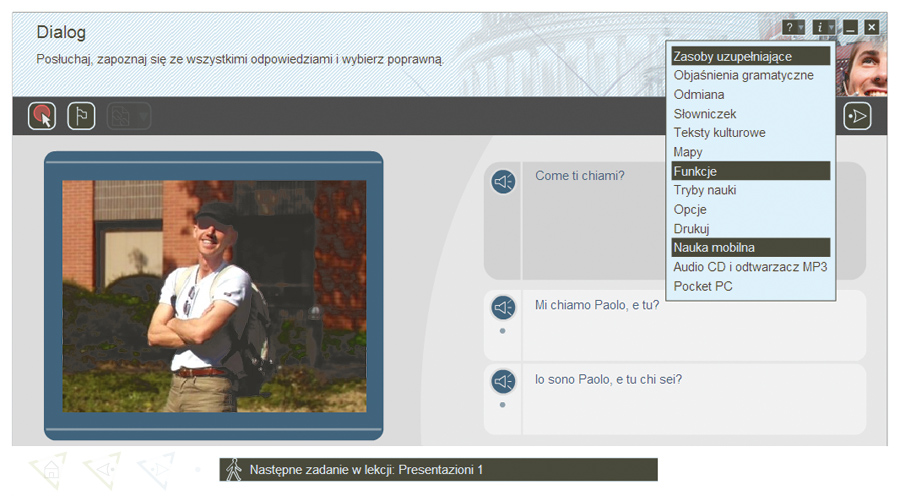 Dla nikogo, kto już zetknął się z programami z serii Tell Me More (bez względu na język), korzystanie z najnowszej edycji nie będzie problemem. Możemy tutaj znaleźć znane z poprzednich edycji różne tryby nauki (swobodny, z przewodnikiem czy dynamiczny), a także moduły tzw. pracowni tematycznych umożliwiających kształcenie wybranego aspektu danego języka (słownictwo, gramatyka, wymowa itp.). Tak naprawdę wewnątrz pudełka z edycją specjalną znaleźliśmy płytę i instrukcję obsługi z włoskiego kursu Tell Me More Performance.
