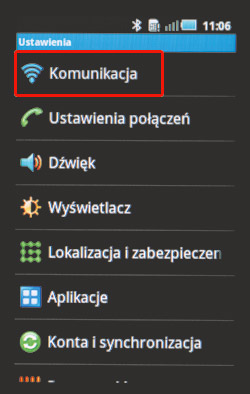 Wywołaj menu podręczne przyciskiem pod ekranem. Następnie otwórz opcję Ustawienia, a potem przejdź do ustawień sieci bezprzewodowej, wybierając Komunikacja.