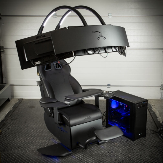 Stacja została wyposażona w wygodny fotel z regulacją lędźwiową i podpórką na nogi, trzy duże monitory o minimalnej ramce, highendowe głośniki Bose, regulowane podpórki pod klawiaturę, myszkę, stojak na duży energy drink lub dla osób pełnoletnich na piwo. Do tego elegancki czarny design z niebieskim podświetleniem.
