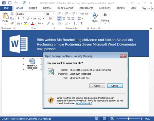 Warto zwrócić uwagę na fakt, iż załączane dokumenty Word nie zawierają makropoleceń VBA. Zamiast tego posiadają złośliwy skrypt VBScript osadzony w dokumencie. Ta technika, aby zachęcić odbiorcę wiadomości do otworzenie fałszywego e-maila, wykorzystuje metody inżynierii społecznej.