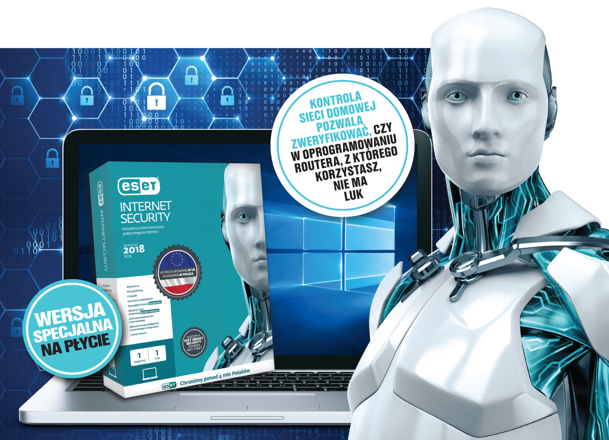 ESET Internet Security 2018 to aplikacja zapewniająca ochronę podczas korzystania z internetu. Wykrywa i eliminuje zagrożenia, nie powodując przy tym spadku wydajności komputera. Jego specjalną wersję znajdziesz na naszym DVD.
