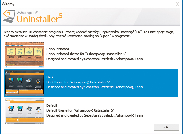 Uruchom program za pomocą ikony na pulpicie Ashampoo Uninstaller 5. Wyświetli się okno Witamy, w którym należy wybrać jeden z trzech dostępnych wyglądów interfejsu użytkownika – w naszym przykładzie wybrany został wygląd Dark. Potwierdź, klikając OK.