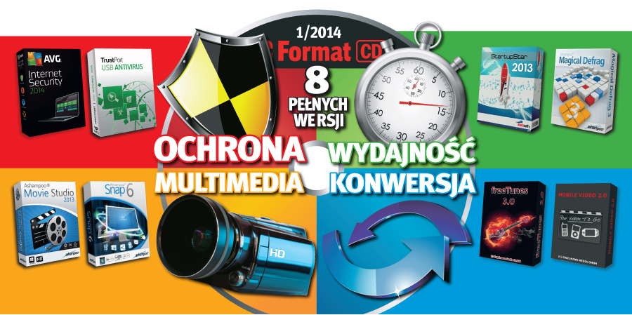 Zestaw programów podzieliliśmy na cztery kolorowe kategorie. W każdej znajdują się po dwie pełne wersje. Ze względu na to, że bezpieczeństwo komputera to podstawa, w pierwszej kolejności polecamy wypróbowanie aplikacji z kategorii OCHRONA – Strażnika komputera, czyli pakiet ochronny AVG Internet Security na rok 2014, a osobom korzystającym często z pamięci USB rekomendujemy Przenośnego ochroniarza danych TrustPort USB Antivirus 2014.