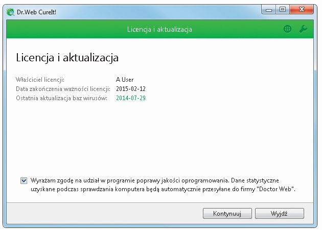 Aplikacji nie trzeba instalować. Jest gotowa do pracy niemal zaraz po uruchomieniu. Jedynym warunkiem skorzystania z niej jest potwierdzenie licencji i chęci wzięcia udziału w programie poprawy jakości oprogramowania. Zaznaczenie pola wyrażenia zgody i naciśnięcie przycisku Kontynuuj oznacza zgodę na przesyłanie danych statystycznych (z zachowaniem pełnej prywatności użytkownika) pozyskanych podczas skanowania systemu do firmy Doctor Web.