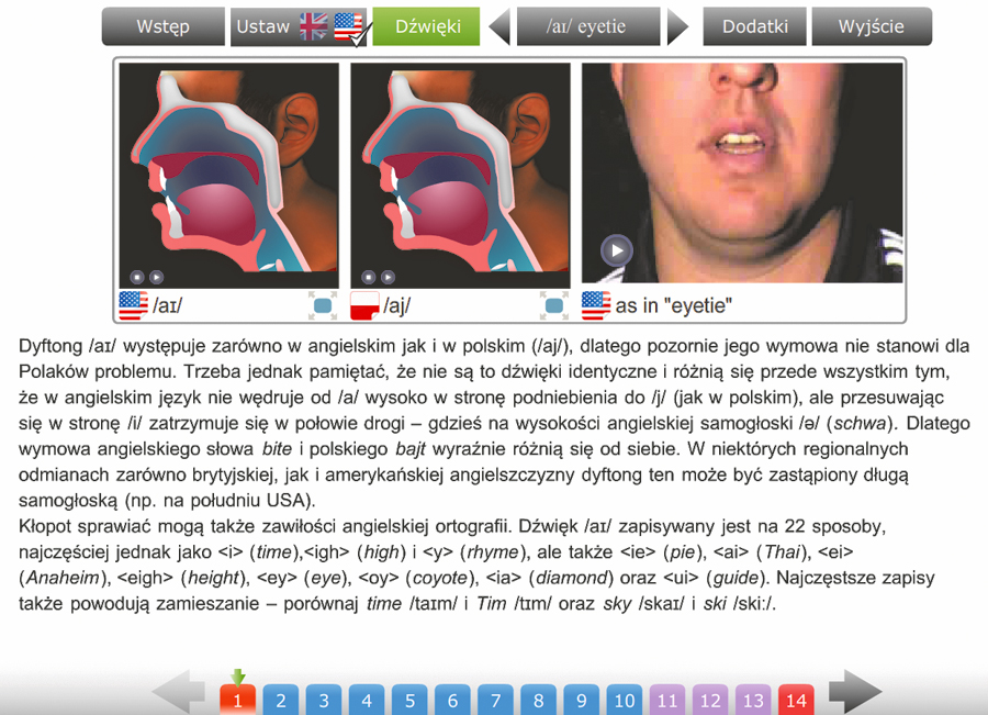 Komputerowa część kursu pomaga zobaczyć (animacje sposobów wymawiania oraz pliki wideo pokazujące ruchy twarzy podczas wymowy) i usłyszeć to, czego w żadnym wypadku nie przekaże nawet najlepsza książka. Mniej tutaj teorii, więcej ćwiczeń. W przypadku samodzielnej nauki jedynym oceniającym możesz być ty sam poprzez porównanie swojej wymowy z nagraniem lektora.