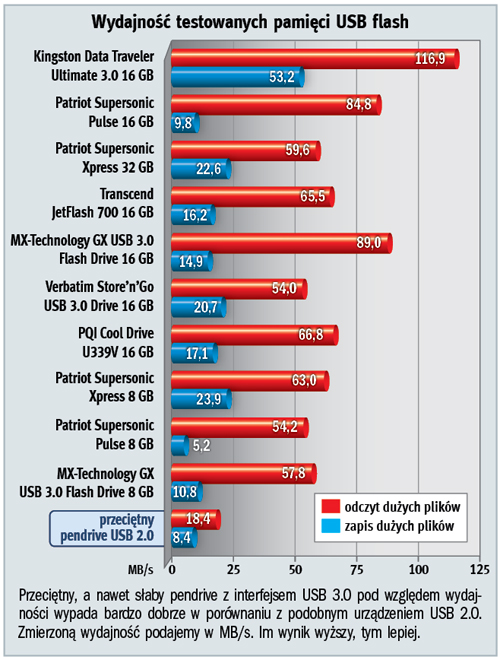 Obok pojemności właściwie jedynym istotnym parametrem jest szybkość zapisu i odczytu. W przypadku USB 3.0 interfejs nie wprowadza praktycznie żadnego ograniczenia przepustowości, zatem producenci mają pole do popisu. Nietrudno znaleźć pamięci o szybkości odczytu 70–100 MB/s – właśnie takie warto kupować. Jeśli szybkość odczytu wynosi mniej niż 30 MB/s albo producent nie podaje na opakowaniu żadnych parametrów, oznacza to, że nie ma się czym chwalić. Pamięci takie, mimo interfejsu USB 3.0, mogą być tak samo wydajne, jak modele starszej generacji.