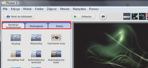 Odszukaj w bibliotece miniaturę zdjęcia, które chcesz poprawić. Kliknij na niej dwukrotnie. Wyświetli się okno edycji zawierające po prawej stronie podgląd zdjęcia, a po lewej panel narzędziowy z trzema zakładkami – pierwsza z zestawem automatycznych narzędzi do retuszu, druga z funkcjami zaawansowanymi i trzecia udostępniającą 12 filtrów do zaawansowanej zmiany wyglądu obrazu.