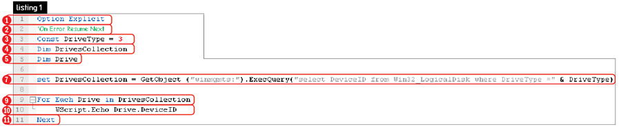 Kolejny fragment – linia 7 – to sekcja referencyjna, w której, przypomnijmy, przypisujesz zadeklarowanym wcześniej zmiennym odpowiednie wartości. W tym przypadku zmiennej DrivesCollection przyporządkowane zostało zapytanie do systemu o liczbę dysków logicznych za pomocą funkcji GetObject, metody ExecQuery i mechanizmu Windows Management Instrumentation (WMI). Ponieważ jednak na razie zajmujemy się pętlami, a nie funkcjami czy zagadnieniami związanymi z WMI, pozostawiamy tę linię bez dodatkowych wyjaśnień – po prostu ją wpisz.