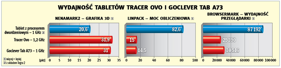 Oba tablety wyposażono w procesory jednordzeniowe – 1 GHz w Goclever i 1,2 GHz w Tracer – które pozwalają na bardzo płynne wyświetlanie animacji. Porównanie wydajności obu tabletów (w odniesieniu do urządzenia z procesorem dwu- rdzeniowym) pokazujemy na wykresach. Ovo ma dwa raz więcej wbudowanej pamięci flash (8 GB), ale obydwa tablety obsługują karty pamięci microSD. Ich port znajduje się w obudowie – tuż obok portu HDMI i miniUSB.
