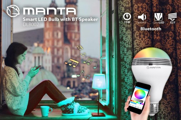 Manta Smart LED Bulb with BT Speaker DLB002 to rozwiązanie łączące w sobie żarówkę LED o zmiennych kolorach świecenia oraz głośnik Bluetooth. Urządzenie po zamontowaniu w standardowym gnieździe żarówki pozwala zmienić typową żarówkę w nowoczesne źródło światła i dźwięku. Po połączeniu ze smartfonem lub innym urządzeniem poprzez Bluetooth możliwe jest sterowanie kolorami świecenia żarówki. Uzyskanie wybranego koloru świecenia jest niezwykle proste, gdyż wystarczy wybrać odpowiedni kolor z bogatej palety barw. Dodatkowo dzięki głośnikowi Bluetooth możliwe jest odtwarzanie muzyki ze smartfonu lub innych urządzeń mobilnych, a także uzyskanie efektów dyskotekowych. Gwint E27 zapewnia łatwość montażu i pasuje do standardowych oprawek żarówkowych. Manta LED Bulb DLB002 współpracuje z urządzeniami typu iPhone4S oraz wersjami późniejszymi pracującymi pod systemem iOS 7.0 i nowszymi, a także urządzeniami Android od systemu 2.3.3.