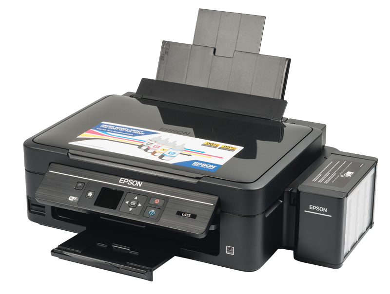Pod względem wyposażenia Epson L455 jest urządzeniem przeciętnym. Z komputerem komunikuje się przez USB, ma także obowiązkowy jak na dzisiejsze czasy interfejs Wi-Fi do bezpośredniej łączności z siecią. Potrafi drukować zdjęcia bezpośrednio z kart pamięci, w czym pomaga niewielki, wręcz symboliczny ekranik LCD. Podajnik papieru nie jest duży – to tylna taca o pojemności 100 kartek. Sprzęt ma skaner o rozdzielczości 1200×2400 dpi i jest zarazem kopiarką obsługiwaną bezpośrednio z panelu urządzenia. Drukowanie i skanowanie jest realizowane za pośrednictwem intuicyjnych, spolszczonych sterowników.