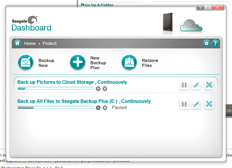 Backup Plus jest sprzedawany z portem USB 3.0, ale można dokupić kontroler FireWire lub Thunderbolt. Bezpłatnym dodatkiem jest program Dahsboard 2.0, który po rejestracji użytkownika umożliwia wykonanie kopii danych z serwisów Facebook i Flickr, a nawet wykorzystanie 4 GB przestrzeni dyskowej w chmurze Seagate (bezpłatnie przez rok). Jest też możliwość szybkiego udostępniania danych. Wystarczy wybrać, do jakiego serwisu w sieci mają być przesłane materiały, i wskazać folder źródłowy.