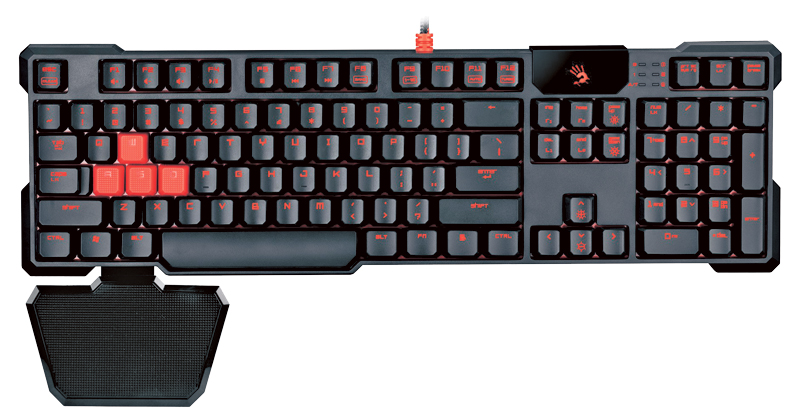 waga 1170g, rozmiar 44,5×14.4,5 cm klawisze 104+12, przełączniki cherry black, interfejs USB, kabel 1,8 m, podświetlenie czerwone, regulowane, www.a4tech.pl