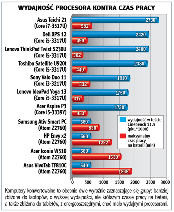 „Atomowe” komputery górują nad ultrabookami znacznie dłuższym czasem pracy na baterii, który może wynieść nawet 12 godzin przy podłączonej klawiaturze i typowym obciążeniu procesora (w naszych testach jest to wyświetlanie filmu HD). Laptop taki jak Asus VivoTab bez obciążenia może być włączony nawet 31 godzin (!). Po odłączeniu klawiatury czas pracy tabletu spada do 20 godzin. To rewelacyjne osiągi, zresztą pozostałe trzy urządzenia też wypadły świetnie. Na ich tle ultrabooki są zaledwie urządzeniami dobrymi albo przeciętnymi. Poza tym odłączane ekrany komputerów z procesorem Atom mają wagę około 700 gramów, są bezgłośne i praktycznie się nie nagrzewają.