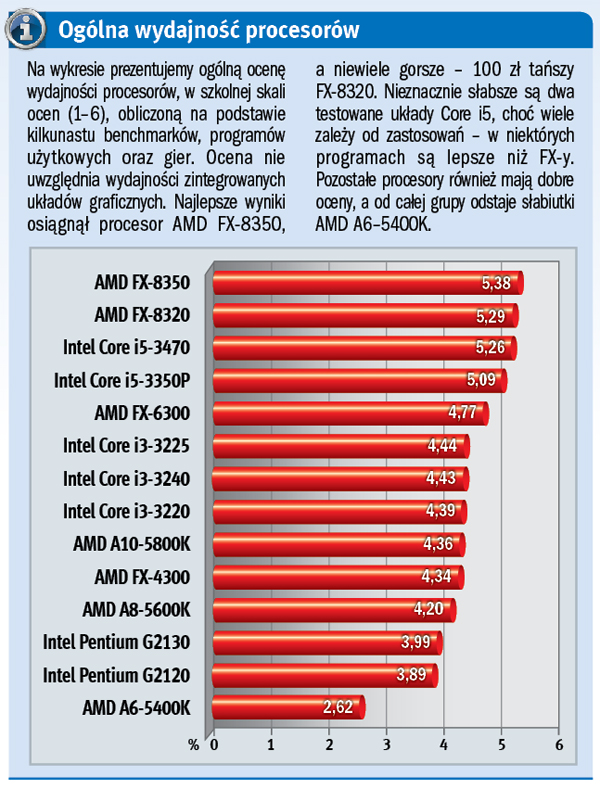 Do oceny wydajności użyliśmy kilku grup programów: aplikacji użytkowych, typowych benchmarków i gier. Najlepsze wyniki uzyskały oczywiście najdroższe procesory AMD FX-8350 oraz Intel Core i5–3470. Środek stawki to układy AMD FX-6300 i FX-4300, Intel Core i3, a także AMD A10 i A8. Procesory Intel Pentium są tylko nieznacznie wolniejsze. Natomiast bardzo słaby okazał się układ AMD A6–5400K – w zasadzie nie kwalifikuje się do domowych pecetów.