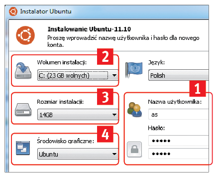 Po uruchomieniu tego pliku zobaczysz okno Instalator Ubuntu, w którym możesz ustawić parametry instalacji. Konieczne jest wprowadzenie w pole Nazwa użytkownika nazwy konta użytkownika, które zostanie utworzone podczas instalacji Ubuntu, oraz dwukrotne wprowadzenie hasła chroniącego dostęp do tego konta (1).