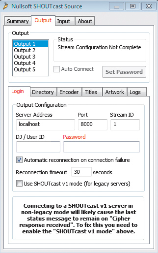 W pole Password wpisz hasło dostępu do serwera. W przypadku serwera MyRadioStream niezbędne jest zaznaczenie opcji Use SHOUTcast v1 mode. W przypadku innych serwerów spróbuj uruchomić transmisję bez zaznaczania tej opcji. Jeśli okaże się, że także nie obsługują nowszej wersji protokołu, pojawi się komunikat o błędzie. Wówczas zaznacz wspomnianą opcję.