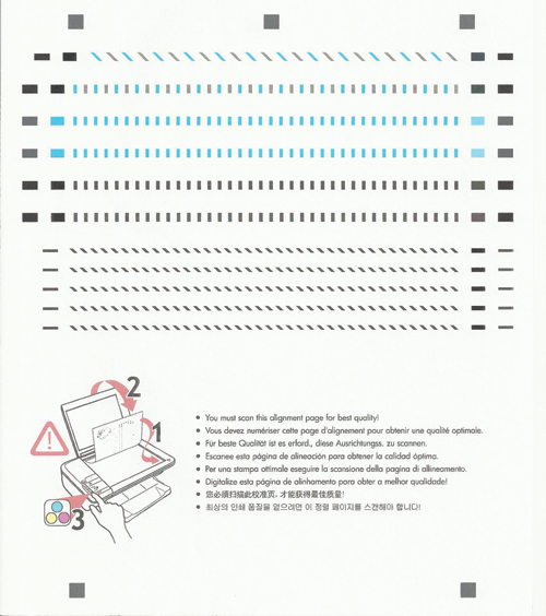 Wielu producentów urządzeń wielofunkcyjnych dołącza do sprzedawanych zestawów specjalną kartę kalibracyjną. Należy jej użyć bezpośrednio po instalacji urządzenia. Kalibracja ma duże znaczenie dla jakości uzyskiwanych skanów, dlatego nie należy pomijać tego etapu. Jeżeli karty kalibracyjnej nie ma w pudełku, bardzo możliwe, że należy ją po prostu wydrukować i zeskanować. Może być zapisana w pamięci drukarki lub zamieszczona w formie pliku na płycie CD zawierającej oprogramowanie do danego modelu drukarki. Karta kalibracyjna to najczęściej zestaw umieszczonych w usystematyzowany sposób symboli. Powyżej widoczna przykładowa karta kalibracyjna dodawana do urządzenia wielofunkcyjnego firmy HP. Szczegóły dotyczące procesu wstępnej kalibracji powinieneś znaleźć w dokumentacji posiadanego urządzenia. Pamiętaj, by nie pomijać procesu kalibracji. Żadne porady nie pomogą, jeżeli skaner nie będzie poprawnie skalibrowany.