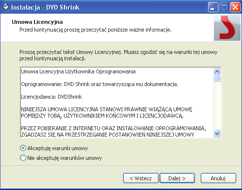 Uruchom instalator programu z dysku twardego. Między oknami przemieszczaj się za pomocą przycisku Dalej. W drugim oknie zaznacz Akceptuję warunki umowy . Następnie kliknij Instaluj i Zakończ. Program uruchomi się automatycznie. Jeszcze raz zaakceptuj licencję, zaznaczając pole Akceptuję warunki powyższej Umowy Licencyjnej, a w następnym oknie kliknij Zakończ.