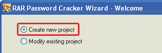 Po uruchomieniu programu, co następuje automatycznie bezpośrednio po zakończeniu instalacji (o ile tylko nie modyfikowałeś domyślnych jej ustawień) lub po kliknięciu skrótu do programu w menu Start, zobaczysz okno: RAR Password Cracker Wizard – Welcome. Upewnij się, że jest w nim zaznaczona opcja Create New Project, i kliknij Dalej.