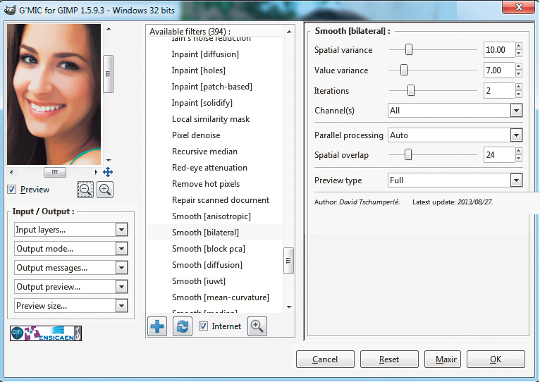 W okienku wtyczki G’MIC na liście Available filters odszukaj kategorię Repair i rozwiń ją. Znajdź efekt Smooth [birateral] i ustaw położenie suwaków w taki sposób, jak pokazany w naszym przykładzie. Aby zastosować efekt, kliknij najpierw Apply, a następnie OK.