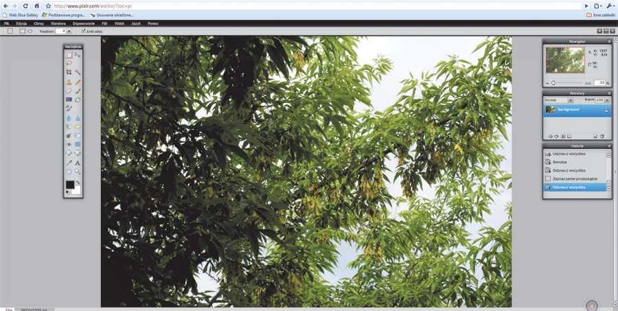 Chcesz poprawić i wyretuszować zdjęcie przed wysłaniem znajomemu, a nie masz lub nie możesz zainstalować w danej chwili żadnego programu do edycji grafiki? Skorzystaj ze świetnego serwisu Pixlr (www.pixlr.com). W serwisie znajdziesz działającą przez przeglądarkę WWW aplikację webową o nazwie Pixlr Editor. Program oferuje spore możliwości – szeroki wybór pędzli malarskich, duży zestaw filtrów, efektywne narzędzia do retuszu, a wszystko to gratis, online i także po polsku! Nie musisz niczego instalować. Jedyny wymóg to oczywiście połączenie z internetem. Program zapewnia także możliwość pracy na warstwach. Przy szybkim łączu nie odczujesz nawet, że pracujesz z aplikacją online.