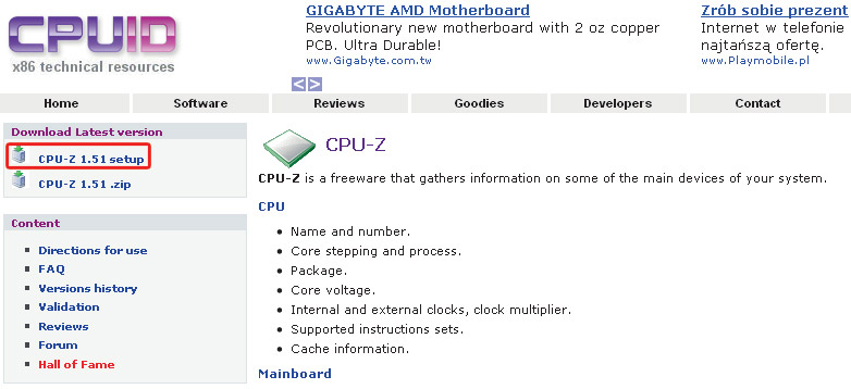 Przejdź pod adres www.cpuid.com/cpuz.php i w lewej górnej części okna kliknij CPU-Z 1.51 setup. Zapisz instalator w dowolnym miejscu na dysku.