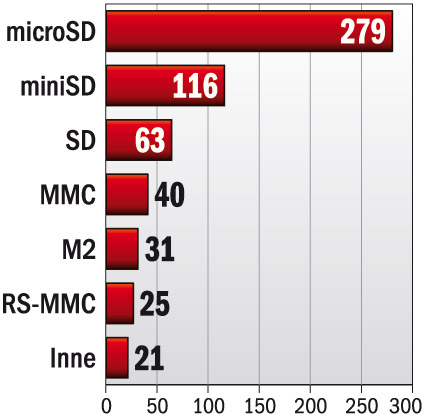 Najszybciej rozwijanymi standardami kart pamięci, nie licząc SD, które popularność zawdzięczają aparatom cyfrowym, są te najmniejsze, czyli microSD i M2.
