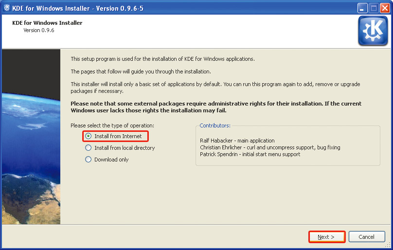 Na naszym krążku znajdziesz instalator KDE SC 4.4.0 do Windows. Plik zamieszczony na CD jest tylko instalatorem. Nie zawiera właściwych pakietów ani aplikacji. Są one w trakcie instalacji pobierane automatycznie z internetu.