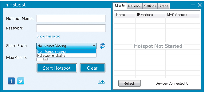 Korzystając z opcji Max Clients, określ maksymalną liczbę klientów, którzy będą mogli jednocześnie połączyć się z twoim punktem dostępowym, a następnie naciśnij przycisk Start Hotspot. W tym momencie program rozpocznie tworzenie wirtualnego hotspota. Gdy na ekranie pojawi się komunikat, oznaczać to będzie, że twój laptop zaczął już bezprzewodowo udostępniać swoje łącze.