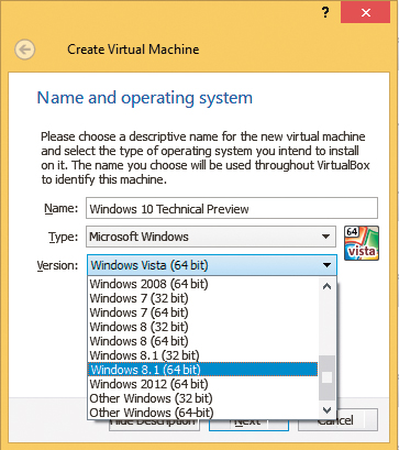 Po zainstalowaniu VirtualBoksa uruchom go i kliknij przycisk New na pasku narzędzi. W pole Name wpisz nazwę wirtualnej maszyny. Najlepiej taką, by łatwo było zidentyfikować, co będzie zainstalowane, np. Windows 10 Technical Preview. Na liście Type ustaw Microsoft Windows i rozwiń listę Version. W zależności od tego, jaki wariant systemu pobrałeś, wskaż 32- bądź 64-bitową wersję Windows 8.1, np. Windows 8.1 64bit. Kliknij przycisk Next.