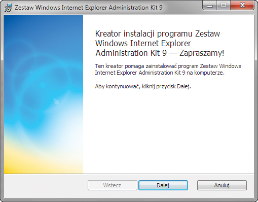 Uruchom pobrany plik instalacyjny pakietu Internet Explorer Administration Kit 9. Zobaczysz okno instalatora Zestaw Windows Internet Explorer Administration Kit 9. Kliknij Dalej.