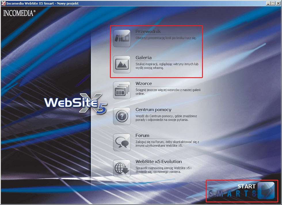 Po uruchomieniu programu zobaczysz okno powitalne. Aby rozpocząć prezentację multimedialną, kliknij ikonę Przewodnik (potrzebne jest połączenie z internetem). Po wybraniu ikony Galeria możesz poszukać inspiracji, przeglądając witryny innych użytkowników w publicznej galerii WebSite X5. Aby przejść do tworzenia własnego projektu witryny, kliknij START.