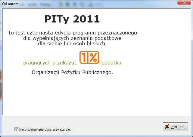 odczas pierwszego uruchomienia programu pojawi się na ekranie krótka notka Od autora. Jeżeli nie chcesz, by okno się wyświetlało podczas każdego uruchomienia programu, zaznacz pole Nie otwieraj tego okna przy starcie. Kliknij przycisk Zamknij.