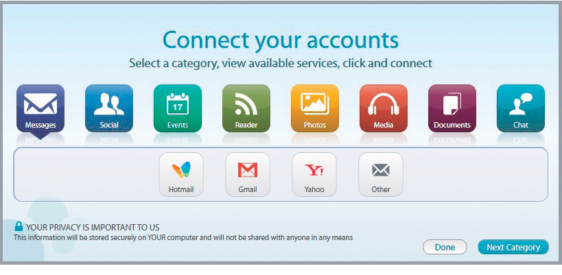 Dla przykładu zaczniemy od serwisu pocztowego Gmail. Aby zarejestrować w programie swoje konto pocztowe, kliknij zakładkę Messages, a z pola poniżej wybierz ikonę Gmail. Wybierając serwis pocztowy Gmail, program zaproponuje również połączenie innych kont Google’a, np. Picasa, YouTube itd.