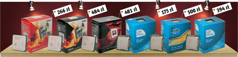 Układ ten ma tylko dwa rdzenie, ale dzięki wewnętrznej architekturze w wielu aplikacjach spisuje się znacznie lepiej niż czterordzeniowe układy AMD A6 oraz FX. Poza tym procesor korzysta z popularnego obecnie złącza LGA1155, w którym bez przeszkód można montować wydajniejsze układy Core i5, a nawet Core i7, co daje znaczne możliwości rozbudowy komputera. Zintegrowany układ graficzny to konstrukcja raczej do biura, choć pozwala także na granie w starsze gry.