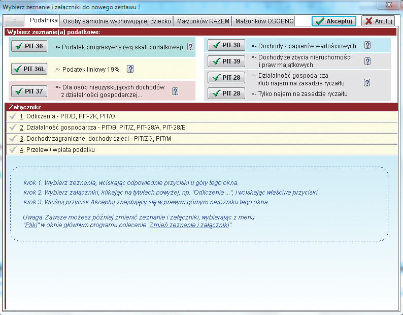 Po wybraniu jednego ze sposobów rozliczenia pojawi się ramka, w której należy wybrać rodzaj formularza w sekcji Wybierz zeznanie(a) podatkowe oraz – jeśli to konieczne – odpowiednie załączniki w sekcji poniżej Załączniki. Kiedy już zaznaczysz odpowiednie pozycje, kliknij przycisk Akceptuj w prawym górnym rogu okna.