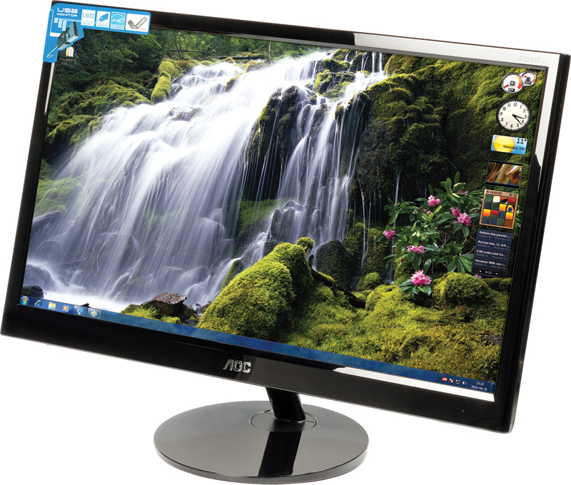 AOC e2251Fwu jest urządzeniem bardzo cienkim – ekran ma tylko 12 mm. Może być używane z podstawką (jak na zdjęciu), ale można się bez niej obejść, bo ramka monitora ma gumowe nóżki umożliwiające postawienie ekranu na stole.