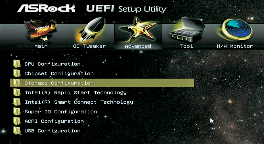 Podłącz dwa dyski do portów SATA 3. Włącz komputer i naciśnij klawisz [F2] lub [Del], by przejść do ustawień UEFI. W ustawieniach przejdź do sekcji Advanced, a następnie w dół do Storage Configuration.