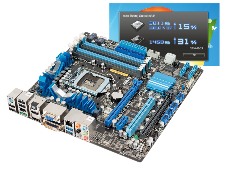 Wybrane procesory Sandy Bridge pozwalają na zwiększanie mnożnika. Płyta Asus P8H67-M EVO ma w komplecie oprogramowanie TurboV, które pozwala w bardzo prosty, automatyczny sposób wydobyć z procesora i zintegrowanego układu graficznego więcej mocy. Za jego pomocą udało się podnieść mnożnik procesora Core i5 2500K z 33x do 37x, a zegar GPU z 850 aż do 1450 MHz!