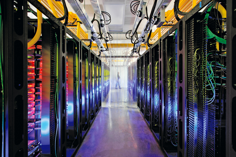 Po pokonaniu Atlantyku twój sygnał opuszcza światłowód podmorski w jednym z punktów lądowania. Tam za pośrednictwem lądowych światłowodów płynie prosto do wielkiego centrum usługowego (data center), w którym działają aplikacje internetowe. Serwery obsługujące aplikacje internetowe już od dawna działają w scentralizowanych fabrykach przetwarzających informacje, wyposażonych często w dziesiątki tysięcy serwerów. Wielkie firmy, jak Google, Amazon czy Microsoft, mają własne centra usługowe, natomiast mniejsze wynajmują serwery, lub po prostu zwirtualizowaną moc obliczeniową.