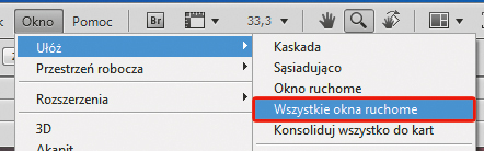 Po uruchomieniu Photoshopa wczytaj wszystkie zdjęcia, przeciągając je na okno programu. Jako podstawy do montażu użyjemy zdjęcia katedry. Jeśli program wyświetlił je w zakładkach, kliknij Okno, Ułóż, Wszystkie okna ruchome, bo to ułatwi przenoszenie zdjęć między dokumentami. Następnie kliknij okno z obrazem katedry, by edytować znajdujący się tam obraz.